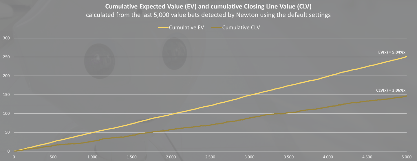 More than EV, this CLV makes it possible to measure the theoretical profitability of a bet, assuming zero variance. Below, you’ll find a chart showing the EV and CLV generated from the last 5,000 value bets detected by Newton — the average monthly volume of the Diamond subscription — based on the default settings.